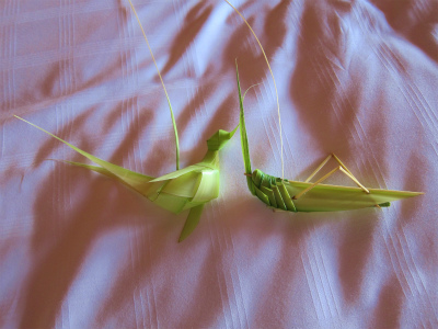 草をしゃっしゃと折ったり切ったりして作ってくれた鳥とバッタ。すげえ、どうなってんの…。